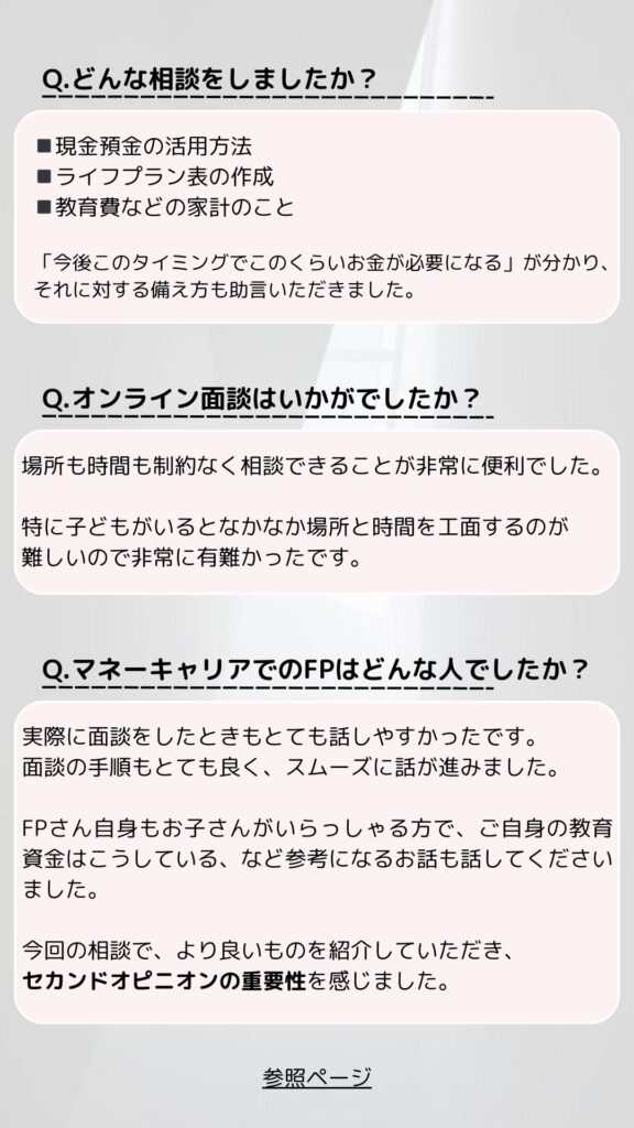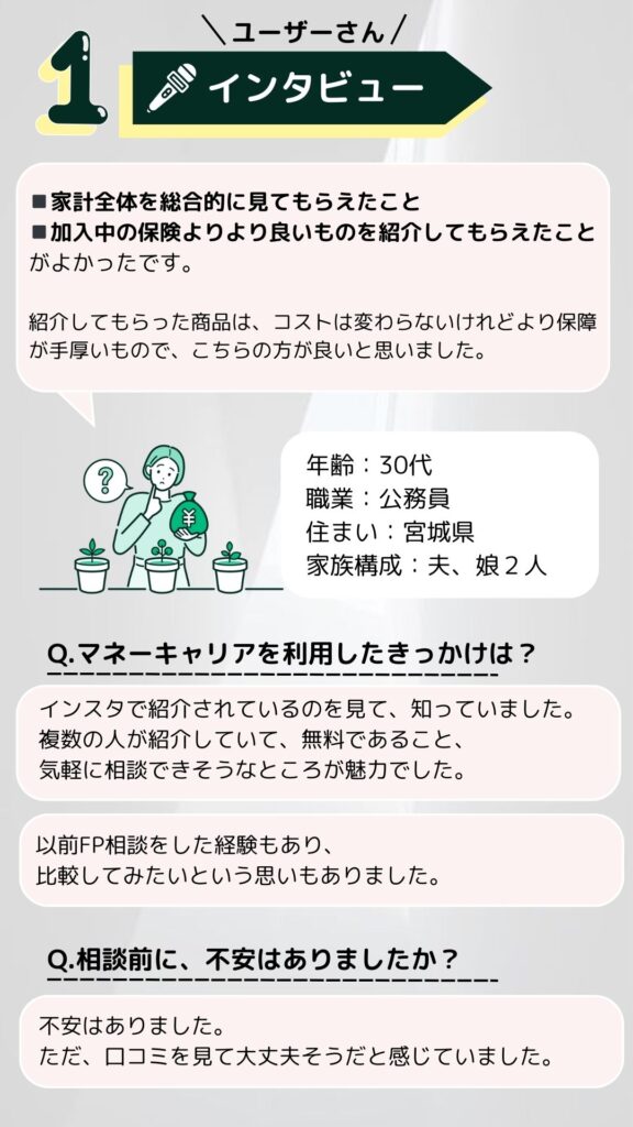 そこで友人に紹介してもらった『マネーキャリアの無料FP相談』を受けてみたんだけど、オンライン面談をしただけで悩みがマルッと解決したよ🙆‍♀️なんでもっと早く相談しなかったんだろうって思った!